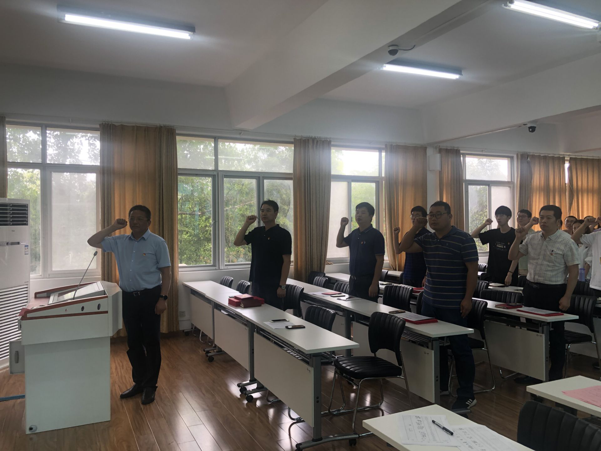 表彰环节过后,公司党委为7月份入党的党员过集体政治生日。张勇带领大家重温入党誓词,并为7月份入党的党员同志发放政治生日贺卡。党员代表韦国森同志发表政治生日感言。