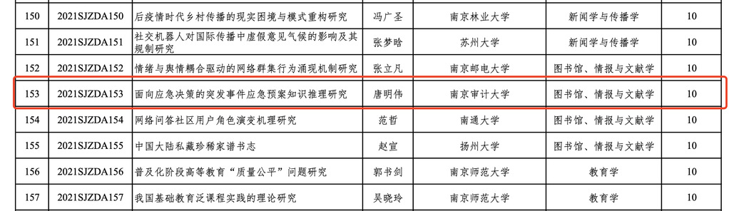 2021年7月16日,江苏省教育厅正式发布了2021年度江苏高校哲学社会科学研究重大项目立项通知,信管系唐明伟副教授申报的课题喜获2021年江苏高校哲学社科重大项目立项支持。