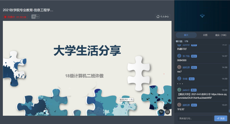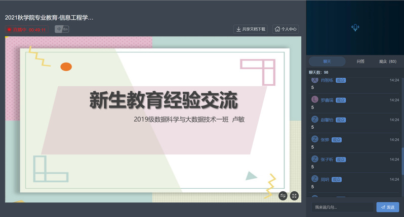 为帮助新生增强南审与公司认同,建立专业观念,明确专业学习目标,合理规划大学学习生活,信息工程公司在公司党委领导下,精心组织了由全体院领导、系部主任和专业班主任参与,覆盖公司、系部和专业班级的新生专业教育系列活动,通过线上直播平台为320多名新生共同开启了大学第一课。