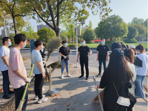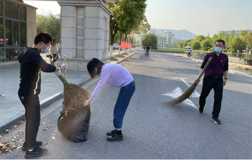 本次打扫的地点主要是校名石至国旗的两侧马路与人行道,重点是落叶等垃圾。下午4点开始,老师与员工党员分工明确、井然有序地打扫指定区域。