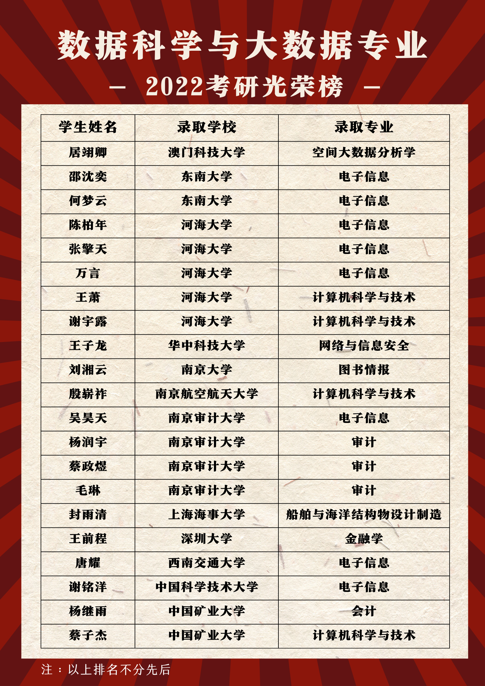 近日,信息工程公司数据科学与大数据技术专业喜讯连连,有21名同学陆续收到中国科学技术大学、南京大学、东南大学等众多著名高校硕士研究生的录取通知,有多名同学签约普华永道、安永等国际知名会计师事务所及光大银行、江苏银行等金融机构等。到目前为止,该专业研究生升学率已达45.6%,就业率达到56.5%,总体就业层次质量高,竞争优势明显。