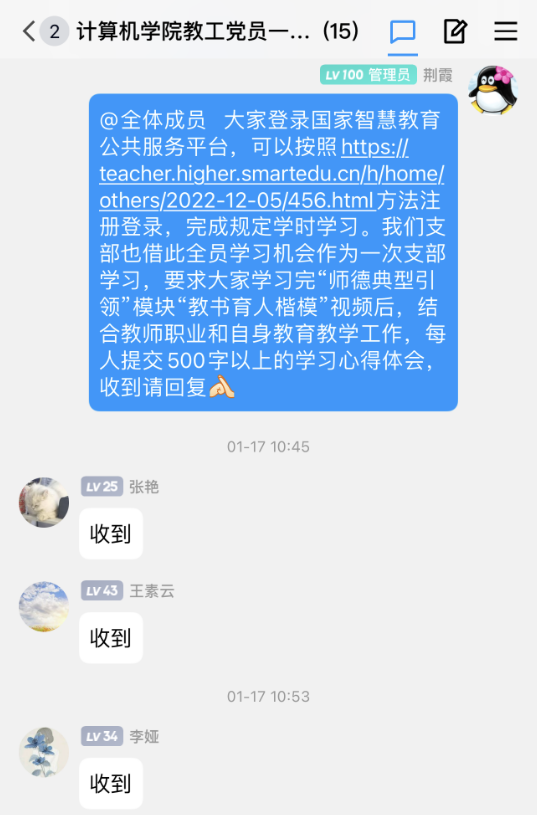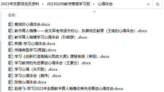 三是开展学习交流,分享学习收获。支部每一位教师都提交了学习心得体会,并通过网络举办线上分享交流会,较好的完成了寒假教师研修任务,取得了预期效果。