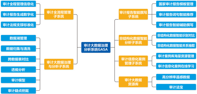 GASA 由 5 个子系统、30 多种功能组件构成,包括: 审计全流程管理子系统,实现审计项目全生命周期的线上管理;审计大数据治理与分析子系统,以工具组件提供数据归集、数据清洗、透视分析、多数据表管理分析等功能;审计报告智能撰写子系统,基于审计语料库提供AI辅助撰写审计报告;非结构化数据识别与智能分析子系统,提供各种文档识别、文档对比、关系抽取等功能组件;审计信息化案例管理子系统,提供审计案例相关资源、案例开发、在线案例学习等功能。