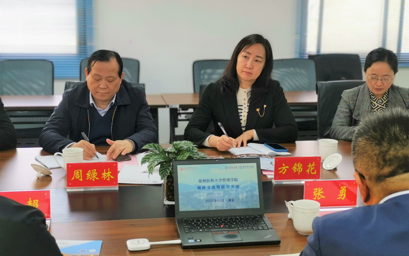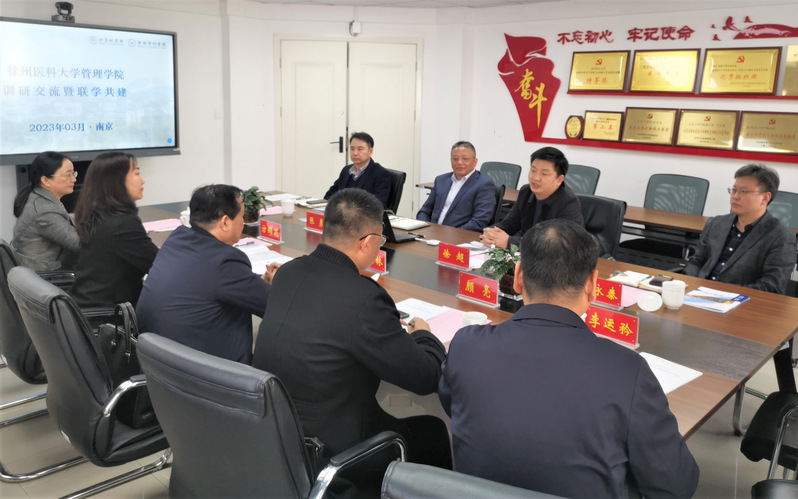 徐超对徐州医科大学管理公司领导班子到访表示热烈欢迎,并介绍了公司在学科专业建设、人才培养以及社会服务等方面的工作。张勇就公司党建工作思路、党建与学科专业融合发展、内部治理体系建设进行了交流,并希望开展共建共治共享,把联学共建活动做出特色、做出成效。