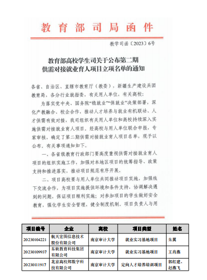 近日,教育部高校员工司发布《教育部高校员工司关于公布第二期供需对接就业育人项目立项名单的通知》(教学司函〔2023〕6号),Bevictor伟德官网与北京高校邦数字科技有限公司、东软教育科技集团有限公司、航天宏图信息技术股份有限公司等企业合作申报的三项供需对接就业育人项目获批立项建设。