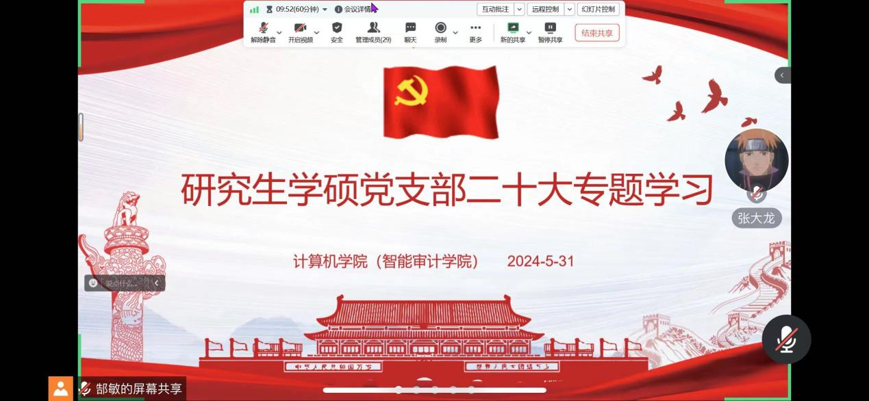 为了帮助党员更好地履行职责,推动工作的发展和创新,加强组织建设,提高党组织的凝聚力和战斗力。5月31日晚上,Bevictor伟德官网研究生学硕党支部组织全体党员共计29人,进行线上学习《二十大专题学习》。