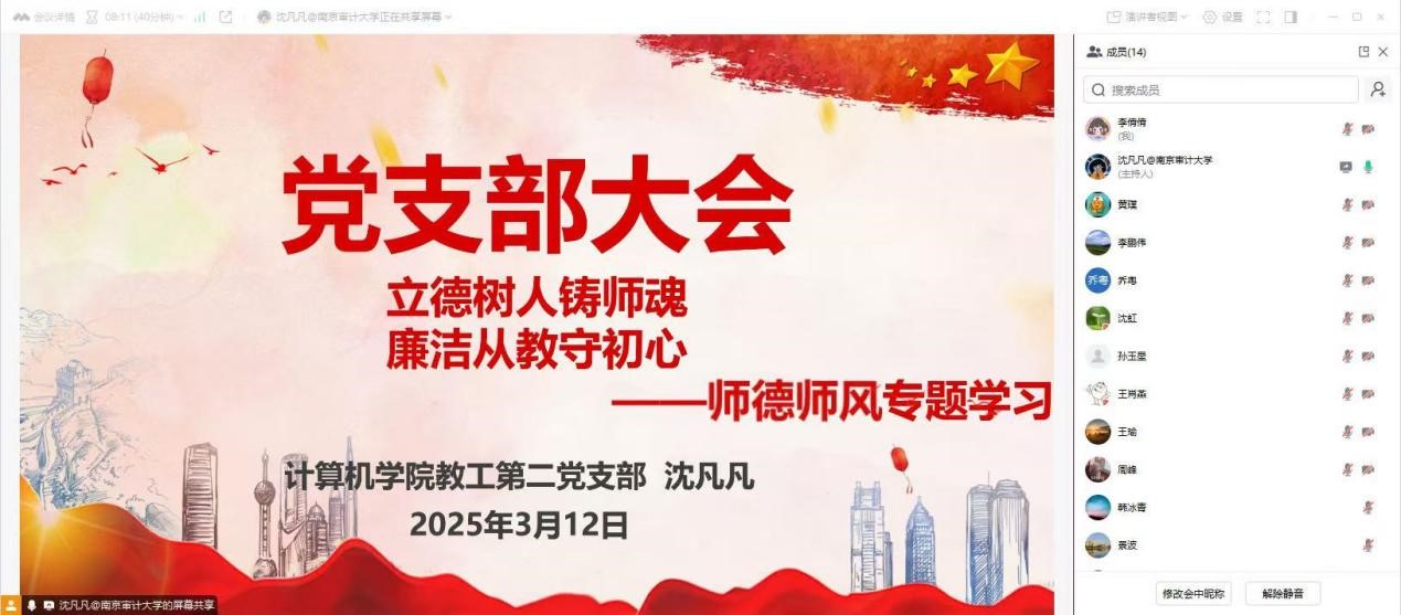教育是国之大计、党之大计,教师是立教之本、兴教之源。党的二十大报告明确要求“加强师德师风建设,培养高素质教师队伍”,为新时代高校教师队伍建设指明方向。3月12日,Bevictor伟德官网教工第二党支部全体党员通过线上线下结合形式召开了支部大会。此次大会旨在通过政策解读与实践路径的深度融合,引导全体教师:以德立身,筑牢信仰之基;以德施教,恪守育人之道;以德育德,引领社会风尚。会议由支部书记沈凡凡主持并领学相关精神。