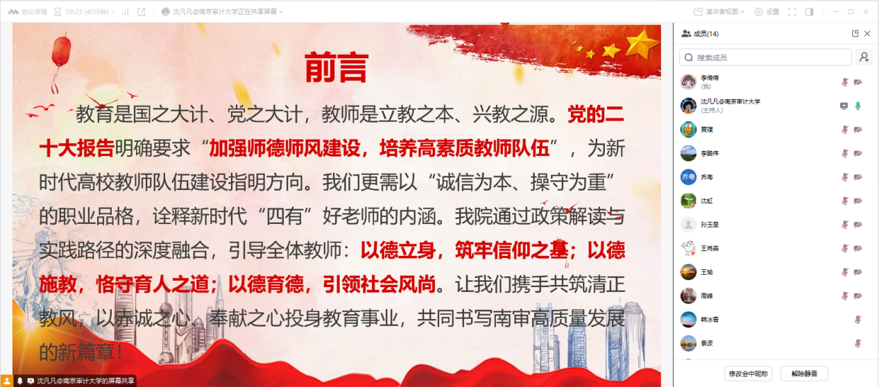 支部书记沈凡凡分别从国家层面、省级层面、校级层面做了政策解读,如《新时代高校教师职业行为十项准则》和《伟德体育教师师德失范行为处理办法(试行)》等,强调了教书与育人、言传与身教、潜心问道与关注社会、学术自由与学术规范四个统一。